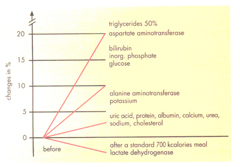 Figuur: effect op waarden van verschillende labotesten, na een maaltijd van 700 kcal. Bron: Guder WG, Narayanan S, Wisser H, Zawta B. Diagnostic Samples: From the Patient to the Laboratory. 4th updated ed. Weinheim: Wiley-Blackwell; 2009.
